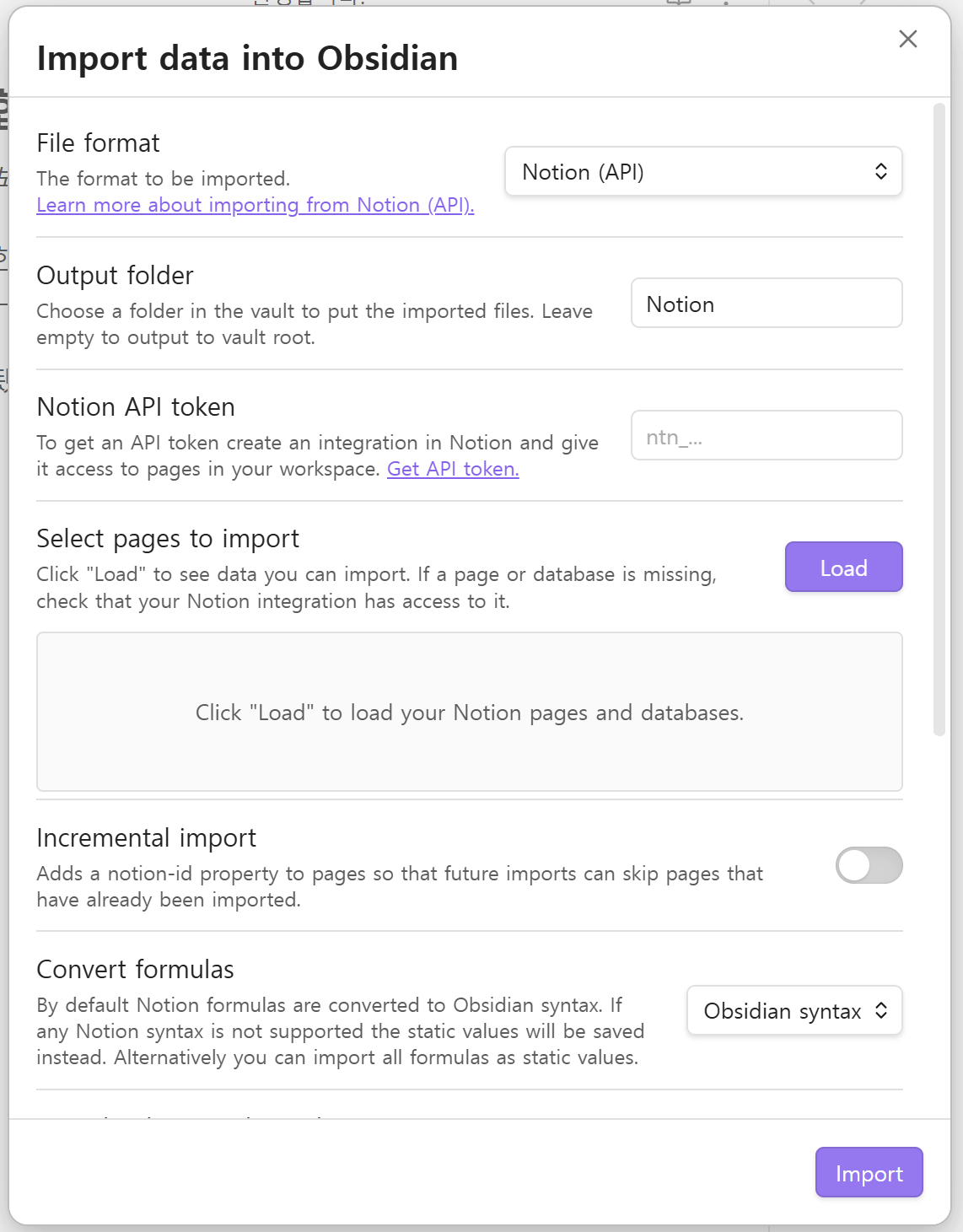나는 토큰이랑 페이지 이름만 선택하고 Import 설정함